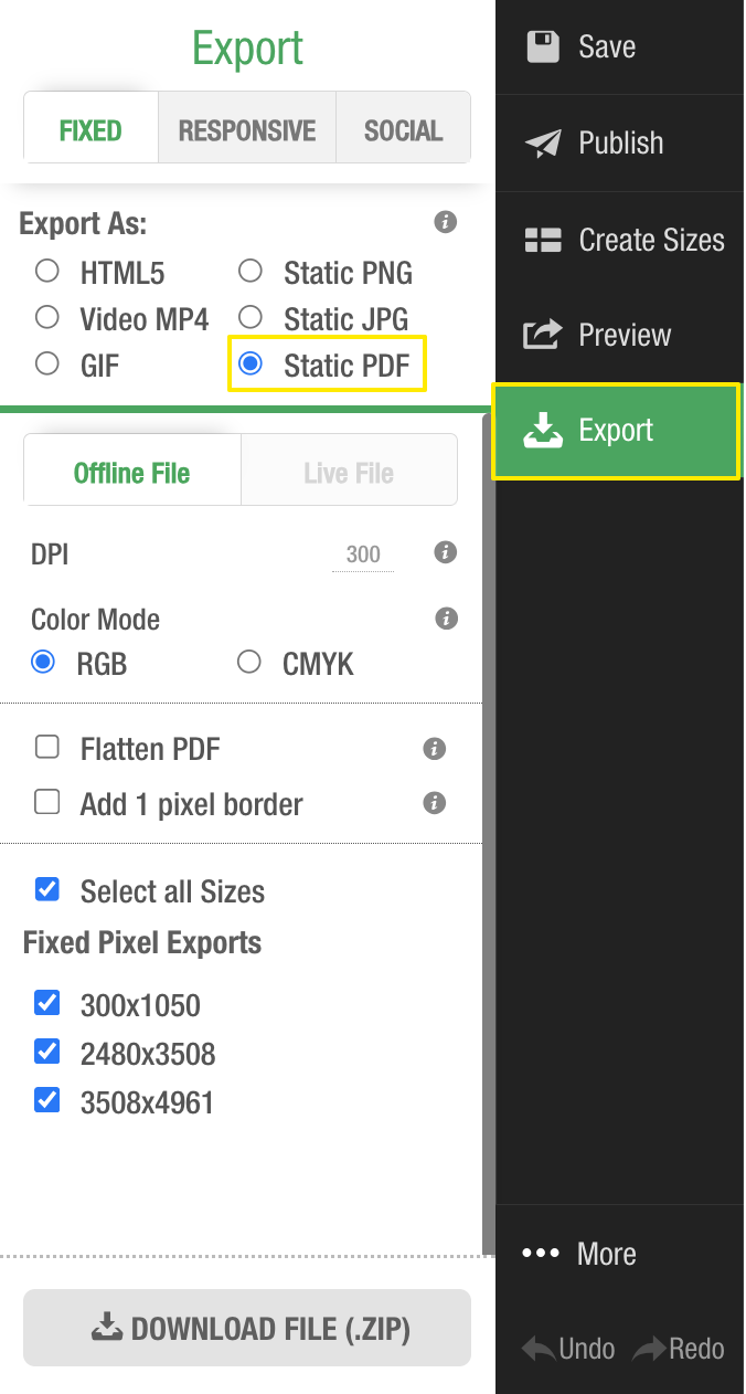 After selecting the properties you'd like applied to your PDF exports, select the sizes you'd like to export and click Download File (.ZIP). This will export a ZIP file containing PDF files of all the sizes you selected from your project.